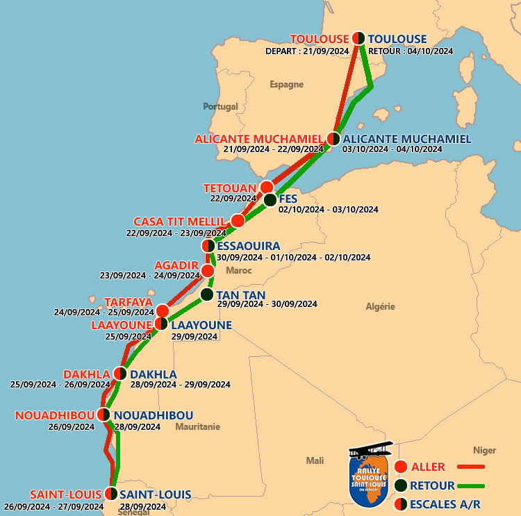 Il fera escale à Tarfaya / Cap Juby, étape mythique, et se terminera à Saint-Louis du Sénégal.